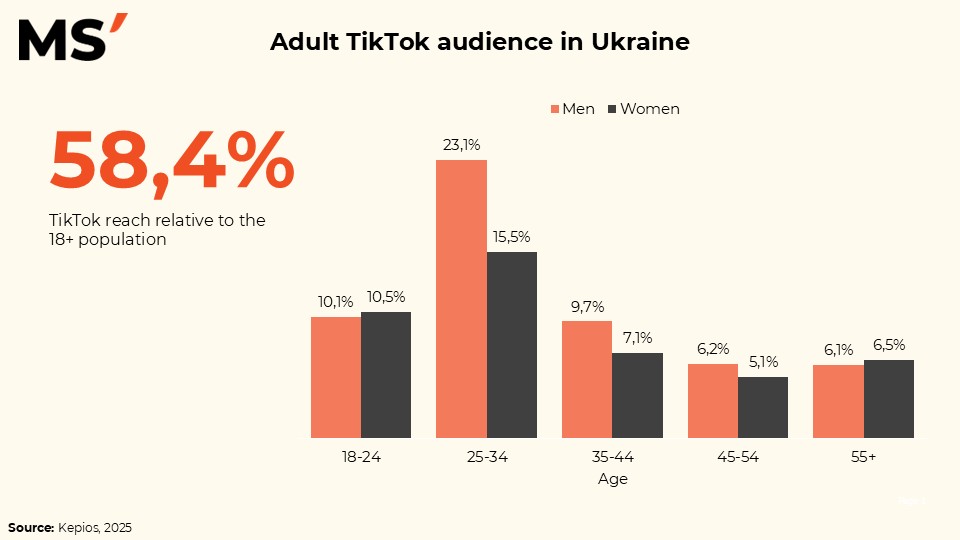 Today, TikTok reaches 58.4% of Ukraine’s population aged 18+, making it one of the most powerful digital channels for brands. The core of the platform is the 25–34 age group: 23.1% of men and 15.5% of women in this segment actively use TikTok. This is an audience with high engagement, strong content consumption, and a clear readiness to interact with brands.