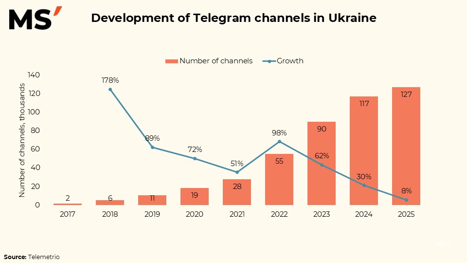 In 2024–2025, the total number of Telegram channels in Ukraine exceeded one hundred thousand. At the same time, annual growth dropped to single digits, clearly signaling saturation. Telegram is no longer about “who enters first,” but about “who delivers value.”