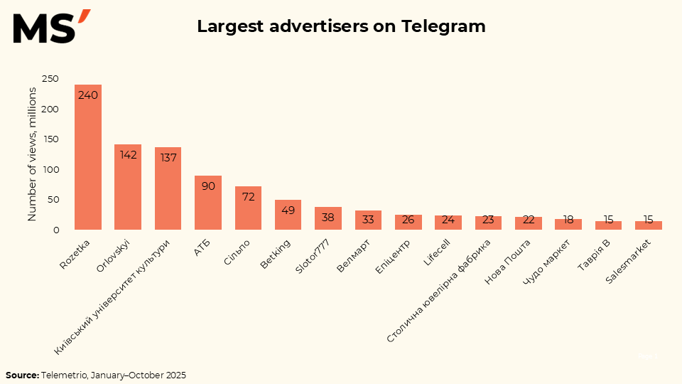 The advertising market on Telegram in Ukraine clearly shows a strong concentration around a few major players. In terms of views, Rozetka is the undisputed leader with more than 240 million views, significantly outperforming other advertisers. It is followed by Orlovskyi (142 million) and Kyiv University of Culture (137 million), both actively using Telegram as a channel for large-scale reach. The top list also includes representatives of the financial and retail sectors — ATB (90 million) and Silpo (72 million), confirming the growing role of the messenger for FMCG and retail brands.