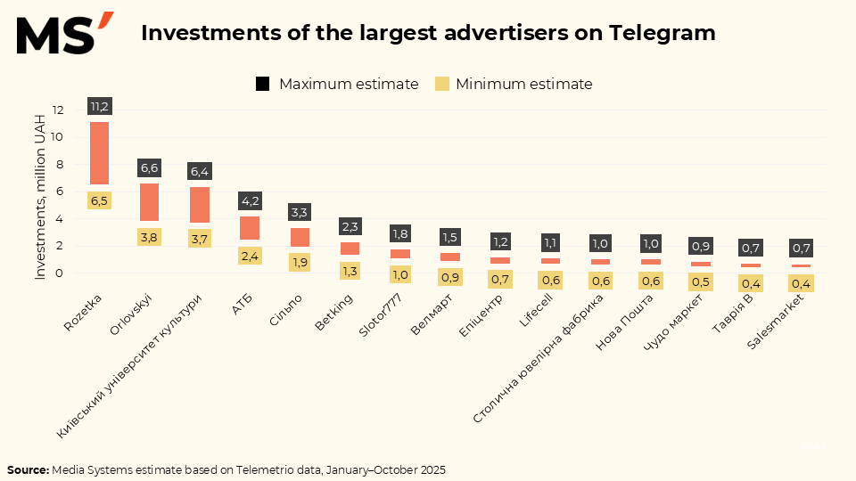 When looking at investments, the picture becomes even more illustrative. Rozetka invests between UAH 6.5 and 11.2 million in Telegram, creating the highest advertising pressure within the platform. Orlovskyi and Kyiv University of Culture operate in the range of UAH 3.7–6.6 million, while most other brands remain below UAH 4 million. This reflects not only differences in budget scale, but also different roles Telegram plays in the media mix — from a branding channel to a stable performance-driven tool.