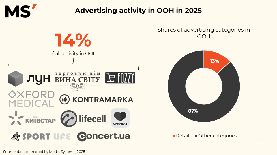 In 2025, advertising in OOH accounts for a notable share of overall campaign activity — 14% of all campaigns are placed in this channel. This confirms that out-of-home advertising continues to be an important tool for reaching audiences in the physical environment.