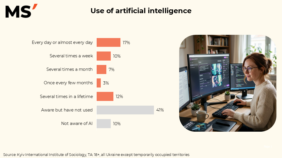 17% use AI daily or almost daily, and another 10% use it several times a week. This is the core group of active users who have already integrated these tools into their everyday processes. At the same time, 7% turn to AI several times a month, while 3% use it even less frequently.