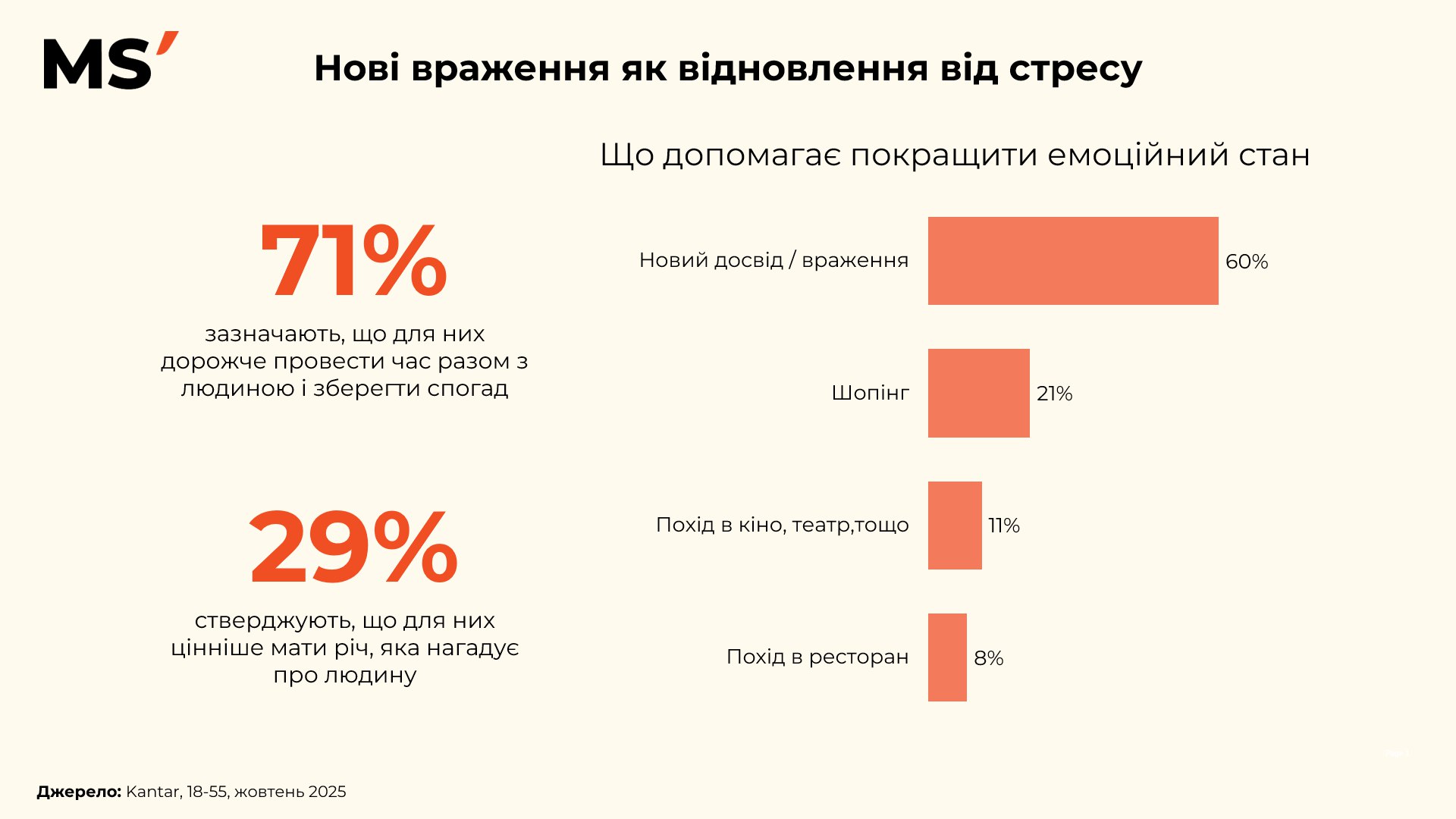У сучасних умовах, коли рівень емоційного виснаження залишається високим, найціннішим ресурсом стають не речі, а відчуття. 71% українців визнають: для них важливіше провести час разом із близькою людиною, ніж придбати щось матеріальне. Такий зсув у цінностях демонструє прагнення до відновлення через людяність і зв’язок.