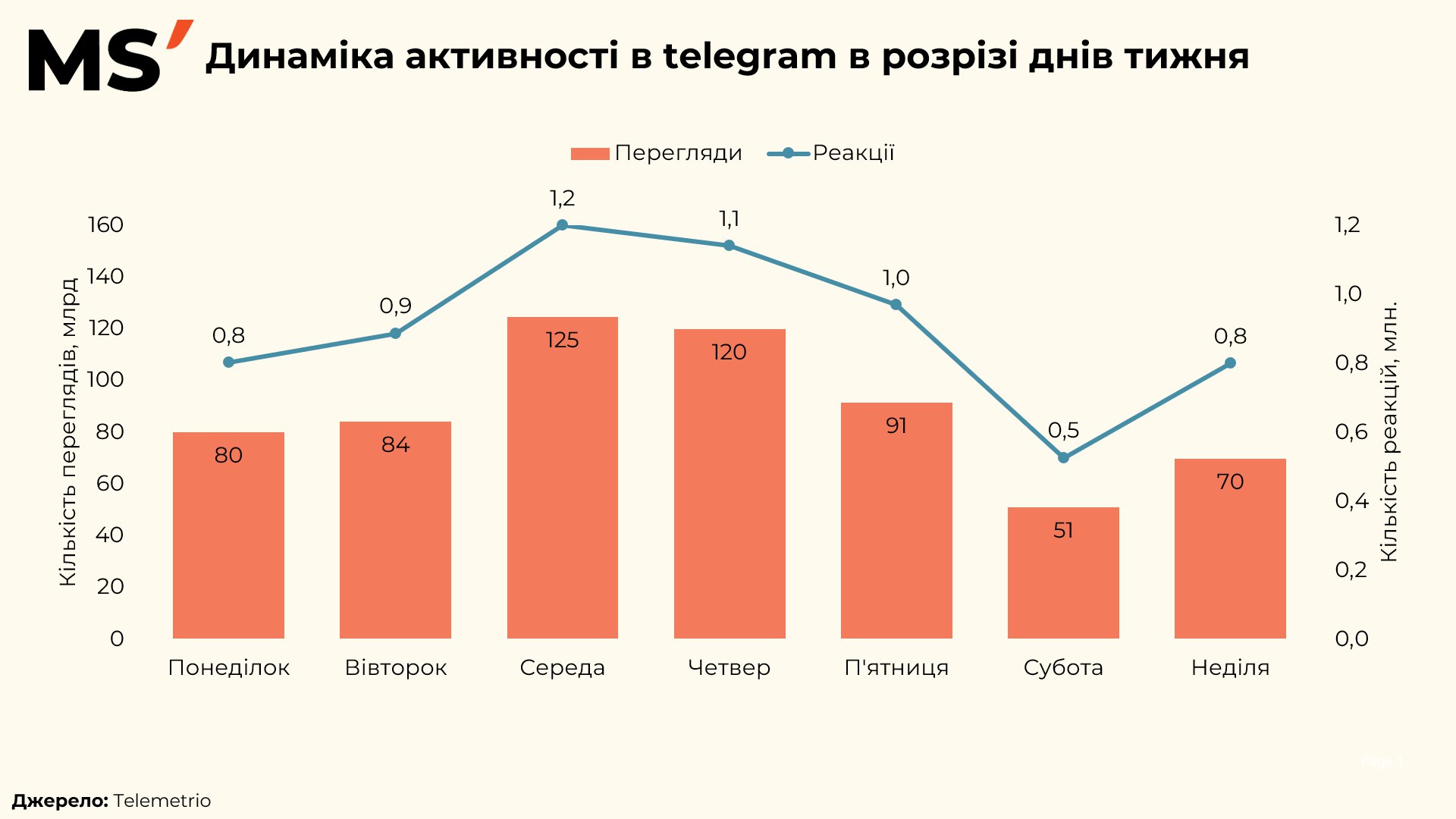 Реакції повторюють цю логіку: максимум фіксується в середу — 1,2 млн реакцій, дещо нижче в четвер — 1,1 млн, а в п’ятницю показник знижується до 1,0 млн. Це свідчить про те, що залученість не лише залежить від обсягу контенту, а й від контексту дня.