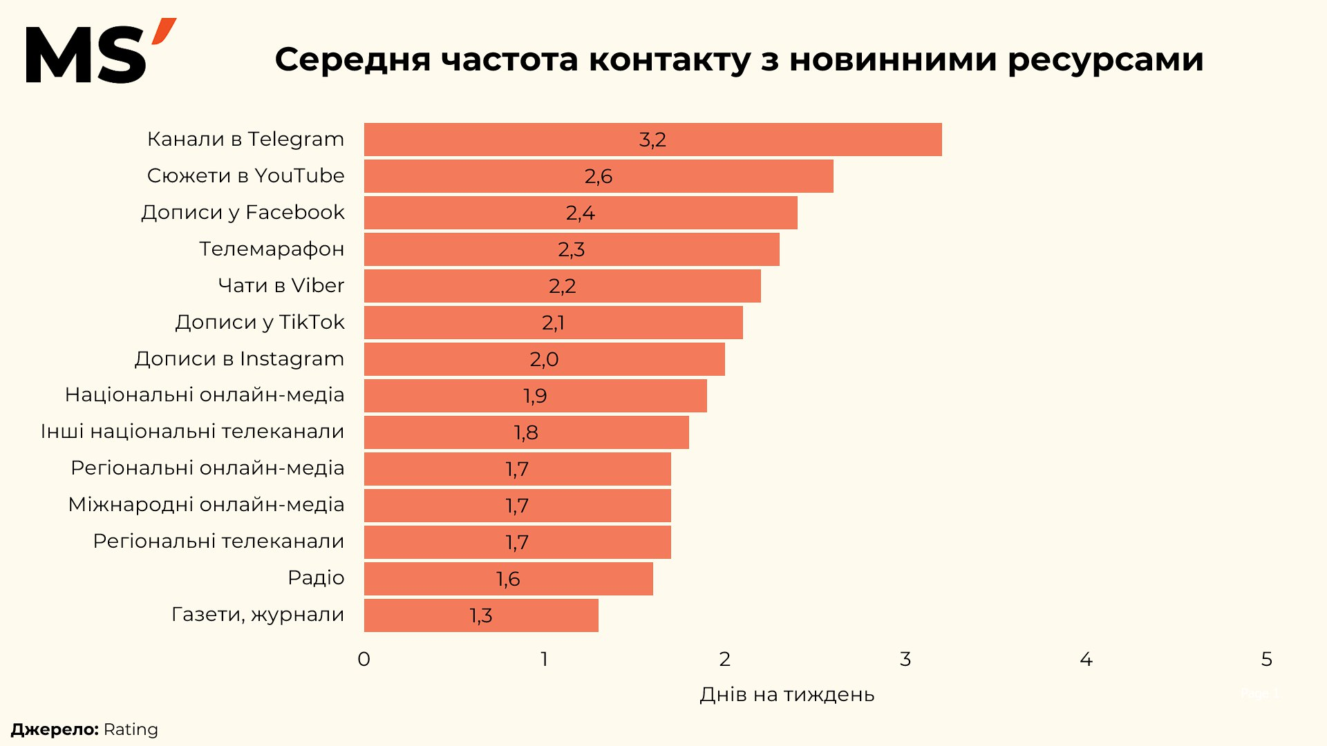 Дещо меншу частоту мали чати у Viber (2,2 дня), TikTok (2,1) та Instagram (2,0). Це підкреслювало, що соціальні платформи все активніше формують звички споживання новин, поступово витісняючи класичні ЗМІ.
