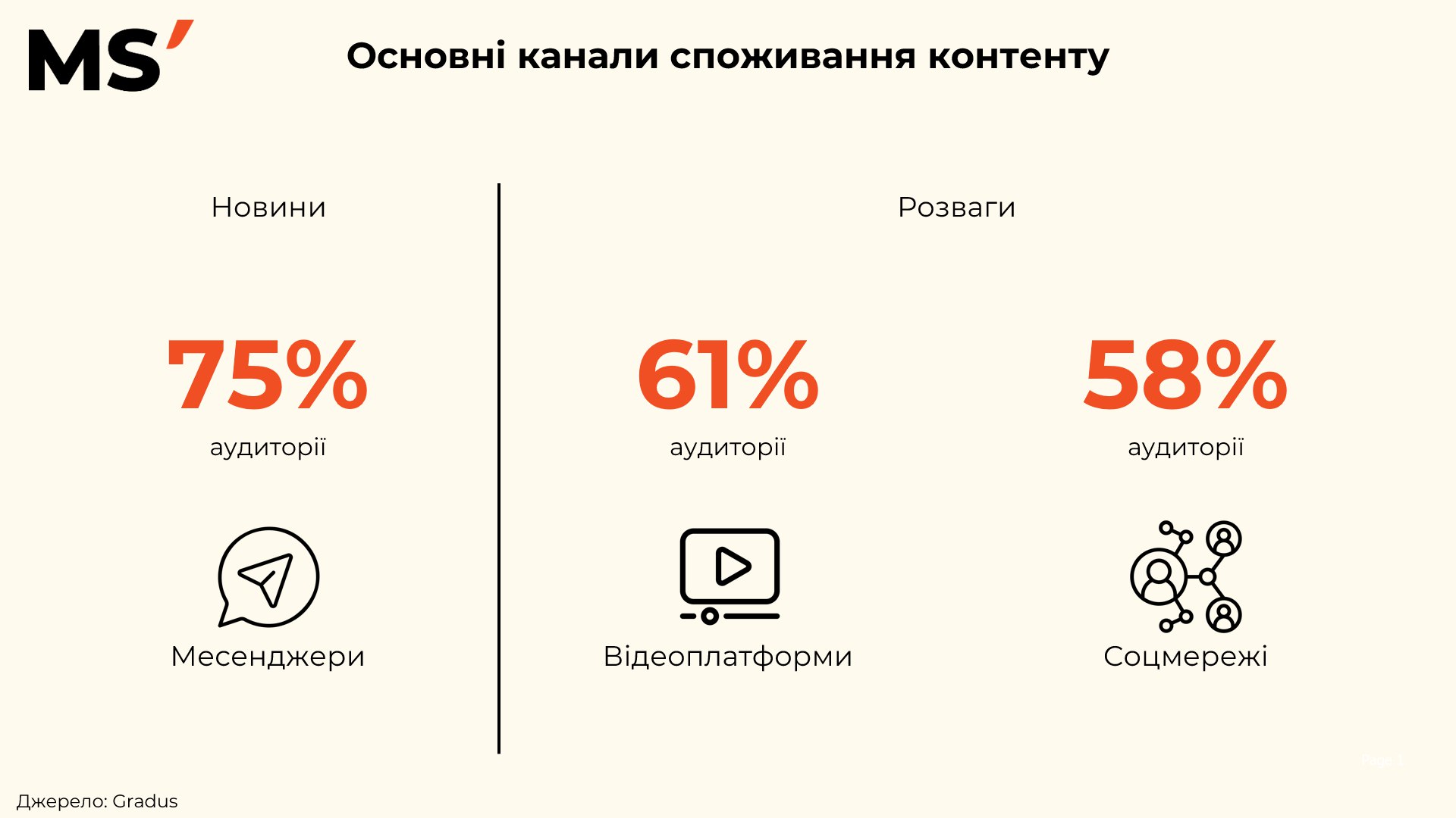 Основні канали споживання контенту сьогодні формують нову логіку планування. Новини залишаються сферою швидкого доступу та персонального контролю інформації: 75% аудиторії отримує їх через месенджери. Це означає, що дистрибуція, формат повідомлення та швидкість реакції стають критично важливими для брендів, які працюють з актуальністю та довірою.