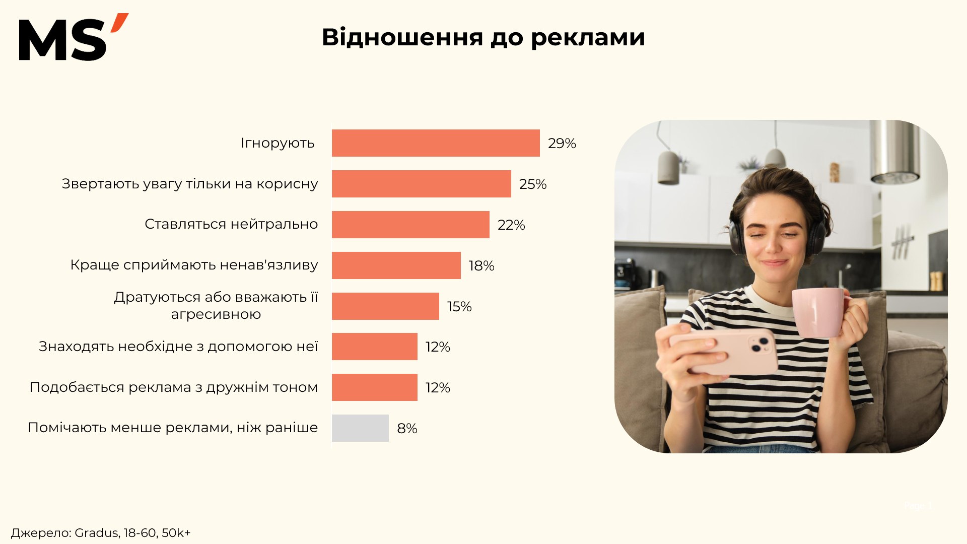 Цікаво, що 18% краще сприймають ненав’язливу рекламу, тоді як 15% дратуються або вважають її агресивною. Це тонка межа: один і той самий формат може працювати або відштовхувати залежно від подачі.